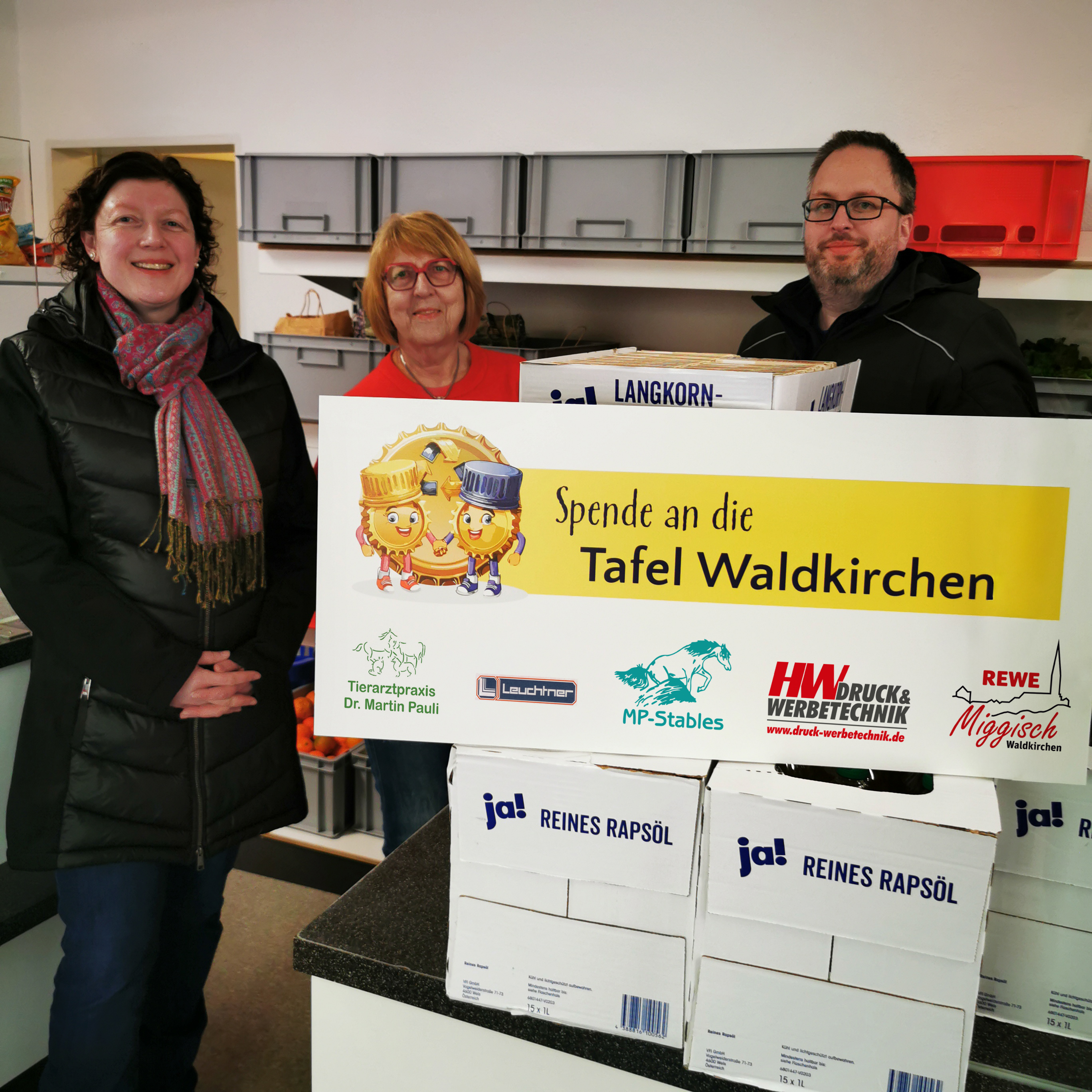 Ein gemeinsames Projekt von HW Druck & Werbetechnik und MP Stables ermöglichte eine Lebensmittelspende an die Tafel: sie sammelten Kronkorken und Alu-Schraubverschlüsse, welche danach zum Schrottwert verkauft wurden. Die Tierarztpraxis Dr. Martin Pauli Waldkirchen, die Firma Leuchtner Jandelsbrunn sowie HW Druck & Werbetechnik Waldkirchen unterstützten die Aktion neben der Sammlung mit zusätzlichen Geldspenden. Beim Kauf der Lebensmittelspende bei REWE Stefan Miggisch in Waldkirchen, verdoppelte dieser die Spendensumme noch einmal. So entstand ein Gesamtwarenwert in Höhe von 400 Euro, der unserer Tafel zugutekam.